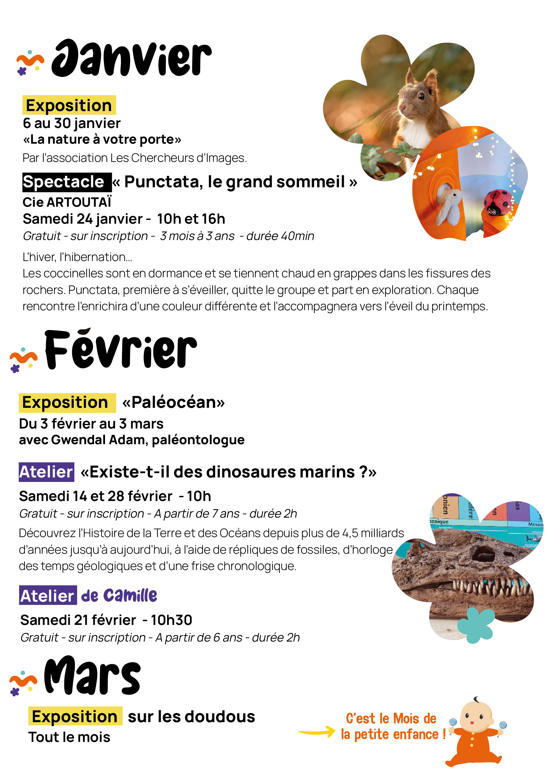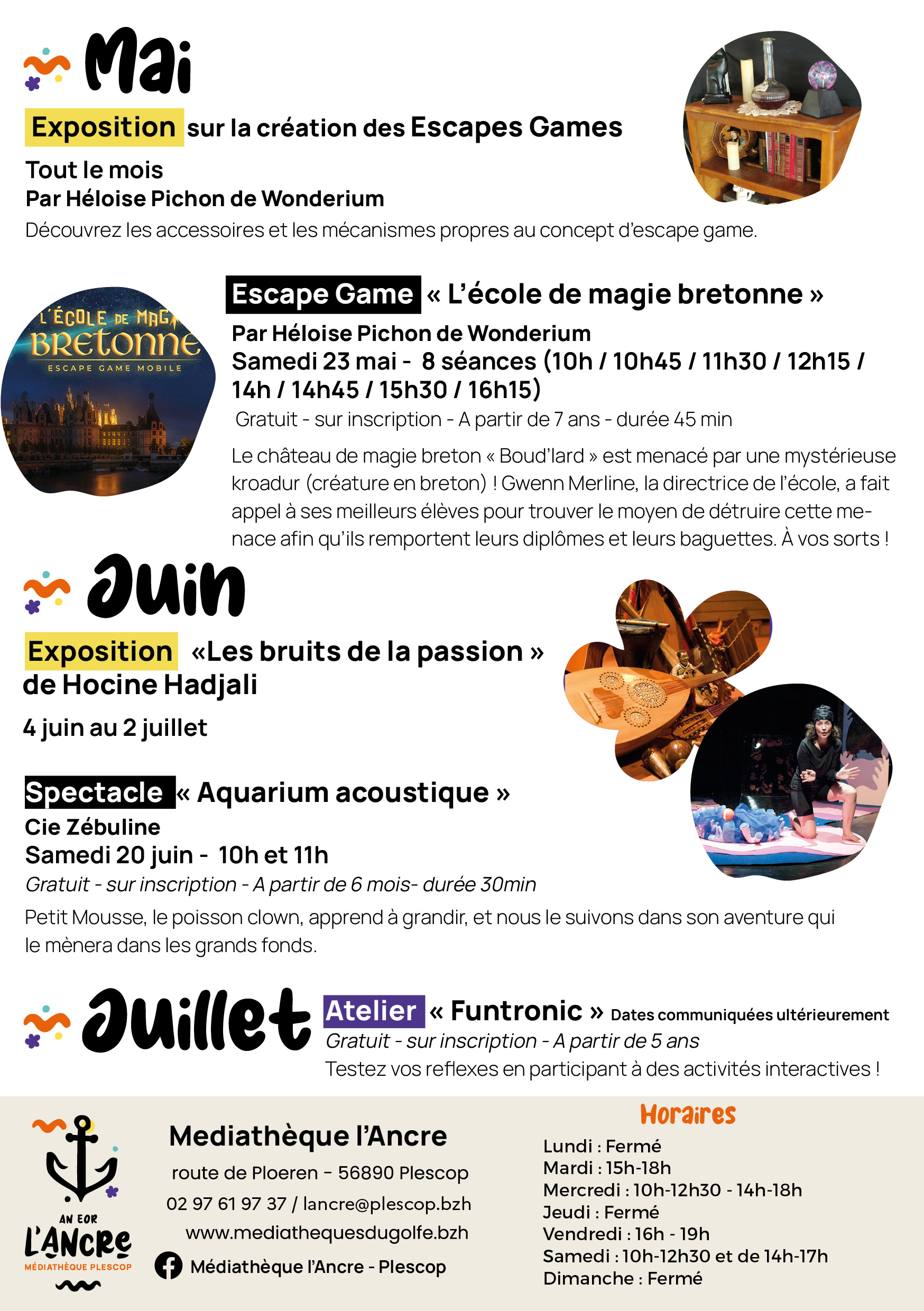 La médiathèque l'Ancre vous propose, de janvier à juillet 2026, une programmation riche et variée, mêlant découvertes, ateliers et expositions pour tous les publics. Au fil des mois, vous pourrez explorer différentes thématiques, participer à des activités interactives et partager des moments conviviaux, que ce soit autour de la nature, des jeux, de la musique ou d’animations dédiées aux tout-petits.