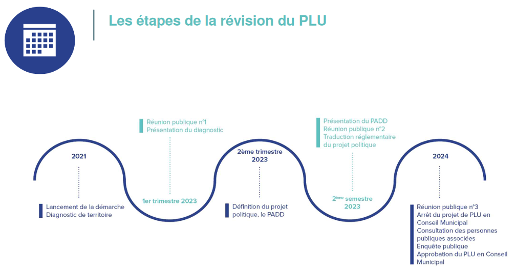 La 1ère grande phase de travail d’une procédure de révision du PLU appelée « phase de diagnostic » consiste en un état des lieux du territoire, ses atouts, ses contraintes et son évolution depuis la dernière révision de 2013. Le diagnostic aborde ainsi l'ensemble des thématiques (la population, l'habitat, le logement, les activités économiques, les équipements publics, les déplacements urbains, l'environnement et les espaces verts, le patrimoine architectural et urbain, etc…) présentant des enjeux pour le développement de la commune.